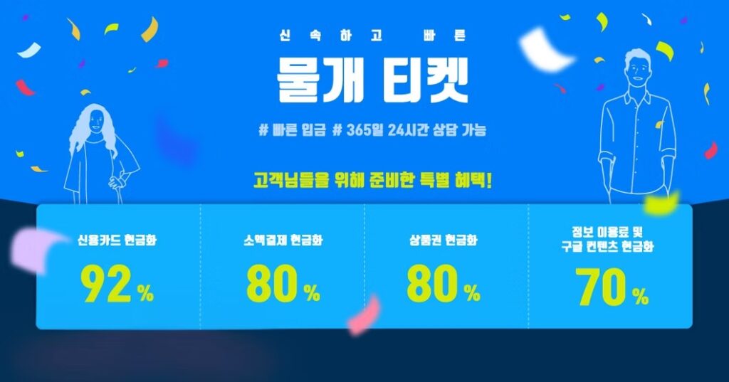 ‘물개티켓’은 업계에서 가장 낮은 20%의 수수료를 적용하여 고객님의 소액결제 현금화를 도와드리고 있습니다. 우리는 당신이 긴급하게 필요로 하는 비상금을 신속하게 준비할 수 있도록 10분 내외의 빠른 진행을 약속드립니다. 고객님의 신뢰와 안심을 최우선으로 생각하며, 저희 서비스를 이용하실 때 어떠한 불안감도 없이 안전하게 이용하실 수 있도록 최선을 다하고 있습니다.